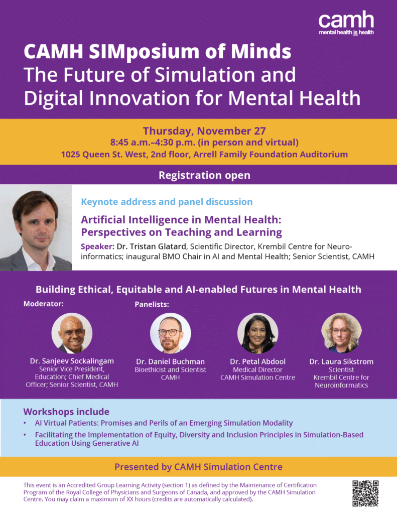 Glatard, T., Buchman, D.Z., Abdool, P., & Sikstrom, L. (2025, November 27). Building Ethical, Equitable and AI-enabled Futures in Mental Health, Panelist at the Centre for Addiction and Mental Health SIMposium of Minds, Toronto, ON, Canada. [Invited]
